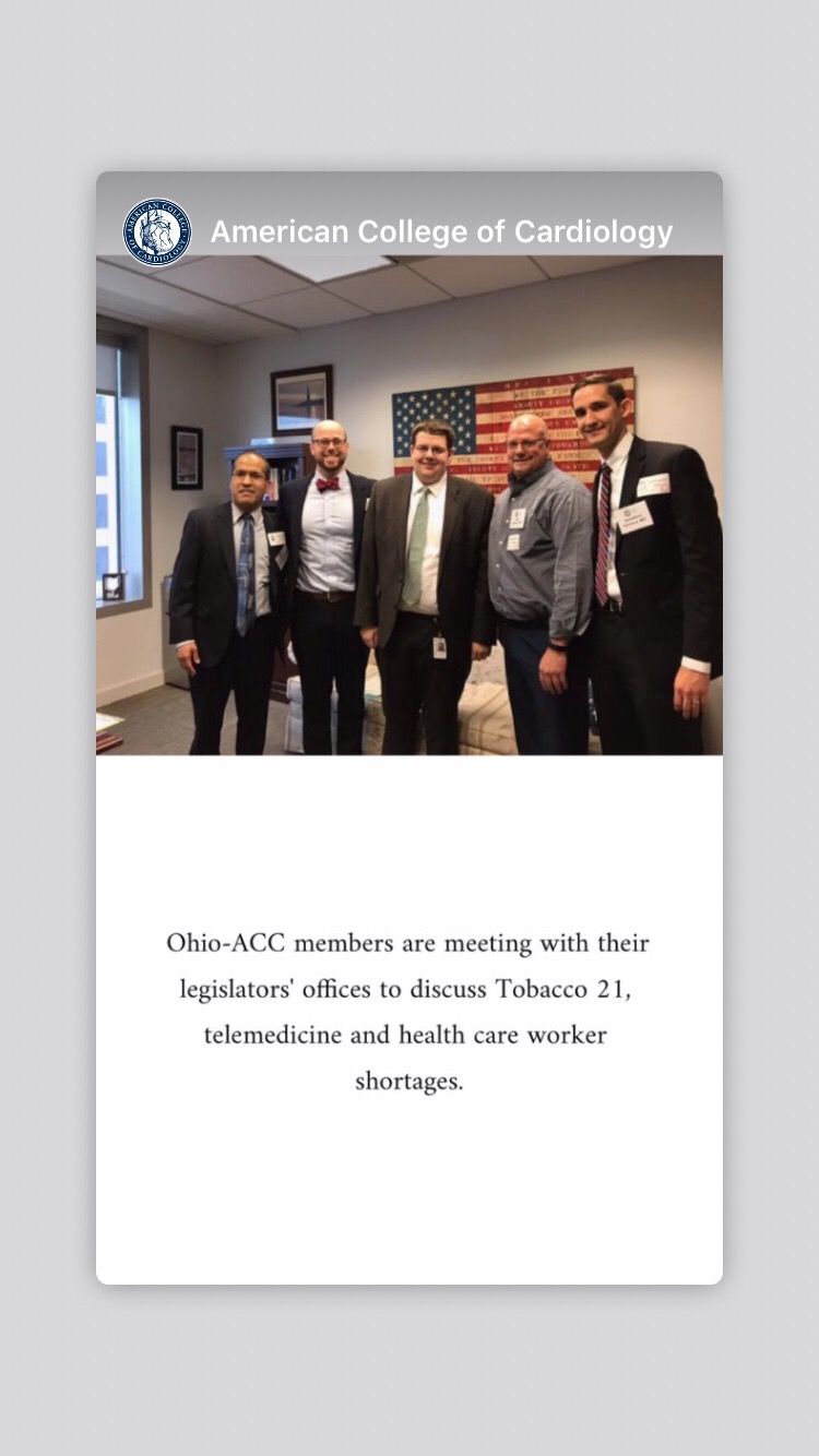 Ohio-ACC Legislative Day held its legislative day and addressed three items in the budget bill, HB 166: Tobacco to 21, Telemedicine, Task Force on Physician, Nursing, and Allied Health Care Work Force, and SB 14/HB 63 addressing transparency of drug pricing.