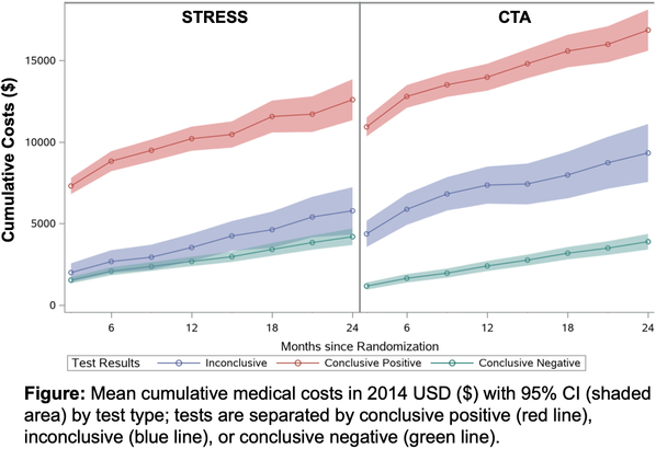 Methods: In the PROMISE trial, patients with suspected CAD were randomized to and received either stress testing (4533 patients) or anatomic testing with coronary computed tomographic angiography (CTA) (4677 patients) and followed for a median of 25 months. Site-determined inconclusive NIT results included those which were non-diagnostic, uninterpretable, or if <85% target heart rate was achieved on exercise or dobutamine. The frequency of inconclusive NIT results by test type, subsequent testing, and the effect on prospectively-collected, cumulative 24-month medical costs using logistic and linear regression models were analyzed. Cost estimates were derived from: 1) the Premier Research Database for index testing, 2) hospital billing data for hospital costs, and 3) Current Procedural Terminology or Healthcare Common Procedure Coding System codes in the 2014 Medicare national reimbursement schedule for physician costs. Total costs (fixed plus variable) were discounted at 3% annual rate and adjusted to 2014 U.S. dollars using the Producer Price Index for hospital care.