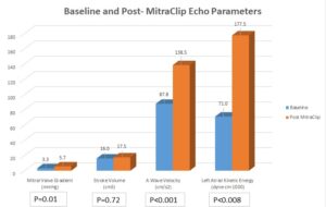 Results: 39 patients who underwent MitraClip procedure were screened. 12 patients were included in the final analysis, 9 with primary mitral regurgitation and 3 with functional mitral regurgitation. Each patient received an average of 1.6 clips.  In comparison to baseline, transmitral A-wave velocities significantly increased (87.8 ± 41 cm/s2 vs. 138.5 ± 44 cm/s2, p < 0.001) after MitraClip. Left atrial stroke volume did not significantly change (16 ± 7.8 cm3 vs. 17.5 ± 13.3 cm3, p = 0.72). There was a statistically significant increase in LAKE (71 ± 64 dyne·cm·103 vs 177.5 +/- 168 dyne·cm·103, p = 0.008). Mean mitral stenosis gradients significantly increased (3.3 ± 2.0 mm Hg vs. 5.7 ± 2.1 mm Hg, p < 0.01).