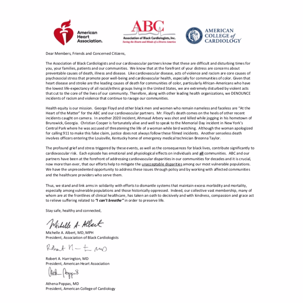 “We must persevere in our commitment to creating a profession – and a society – that recognizes and values every human being, that promotes diversity, that encourages and enables inclusion, and fights to address disparities,” says Athena Poppas, MD, FACC.