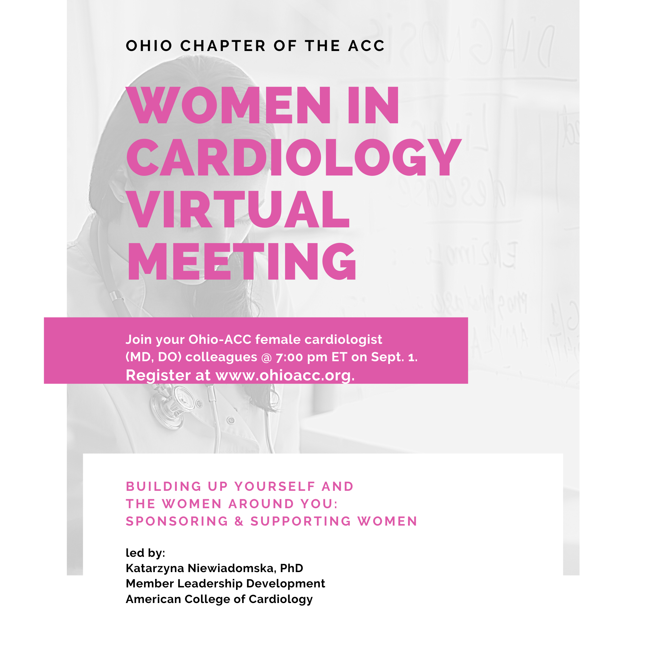 Join your Ohio-ACC female cardiologist (MD, DO) colleagues for a virtual meeting to learn more about Building Up Yourself and the Women Around You.